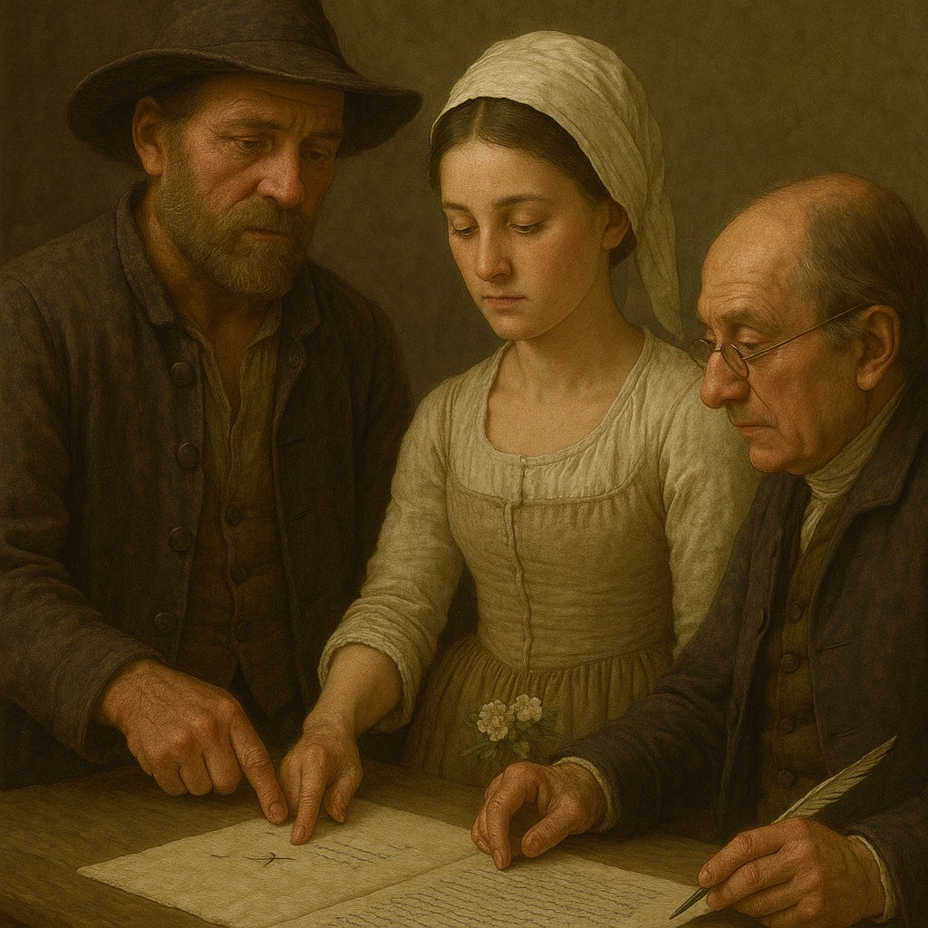 Les deux époux ne savaient malheureusement pas signer, je les ai donc représentés désignant l’acte et non le signant sur l’image de présentation pour être le plus fidèle à la réalité de l’époque.