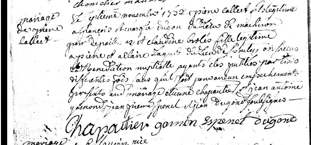 Prenons l’exemple de Jean Pierre CAILLET et Claudine BROLLES, mariés le 7 novembre 1752 à Saint-Félicien (Ardèche).