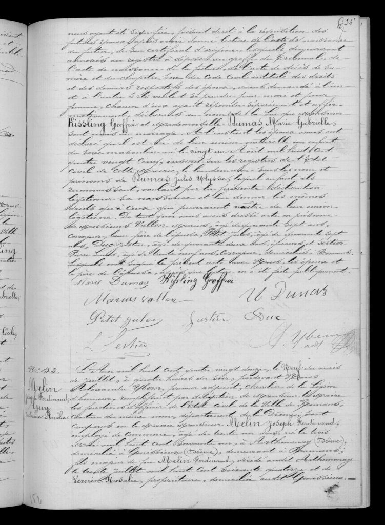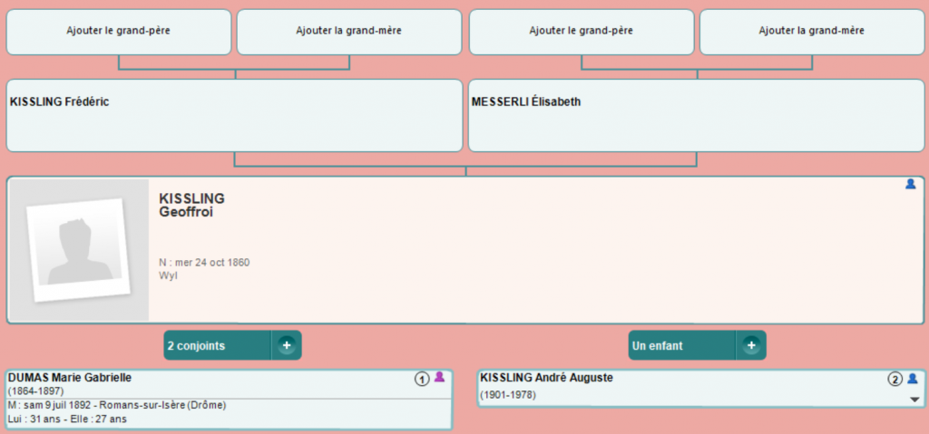 Lors de son mariage, le couple légitime un petit garçon né avant leur union, le 21 août 1885 à Romans-sur-Isère, prénommé Jules Ulysse DUMAS auparavant. Il prend donc le nom de son père Geoffroi KISSLING.