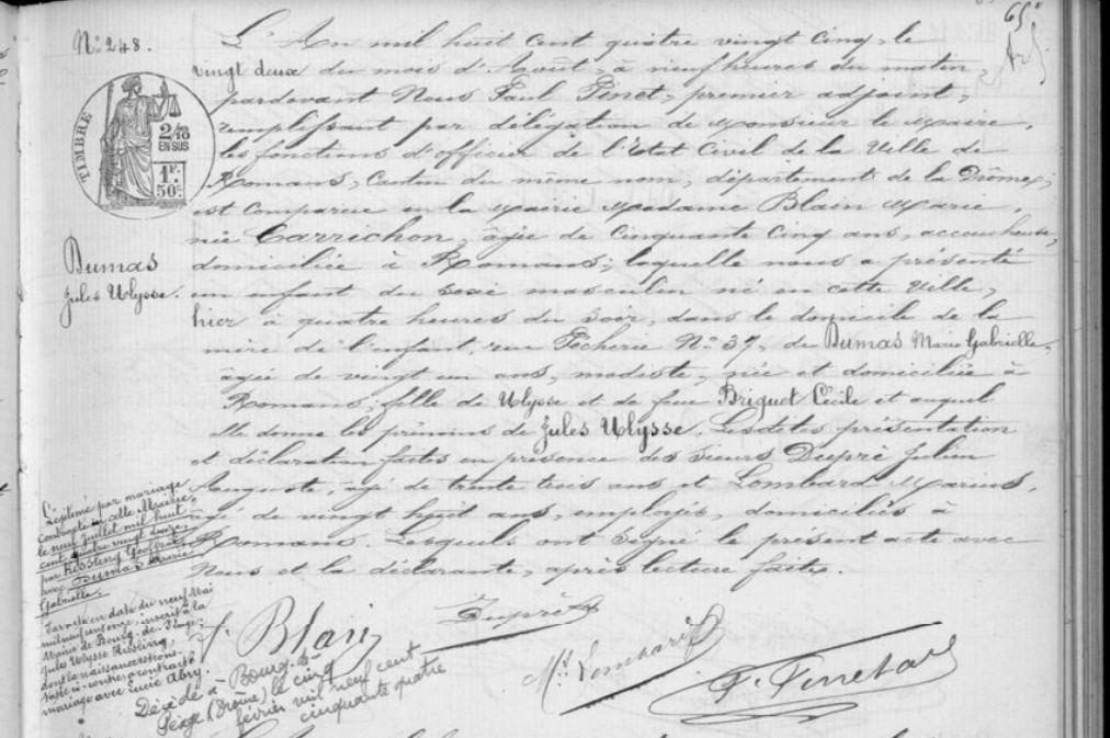 Acte de naissance de Jules Ulysse DUMAS légitimé KISSLING.