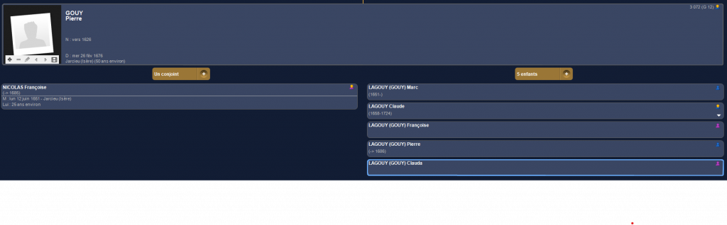 Bloqué à la génération 12 concernant mes ancêtres maternels Pierre GOUY et Françoise NICOLAS mariés le 12 juin 1651 à Jarcieu (Isère)